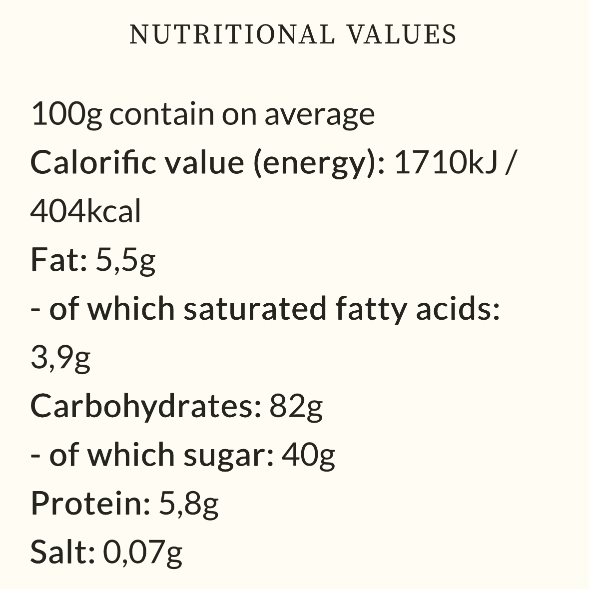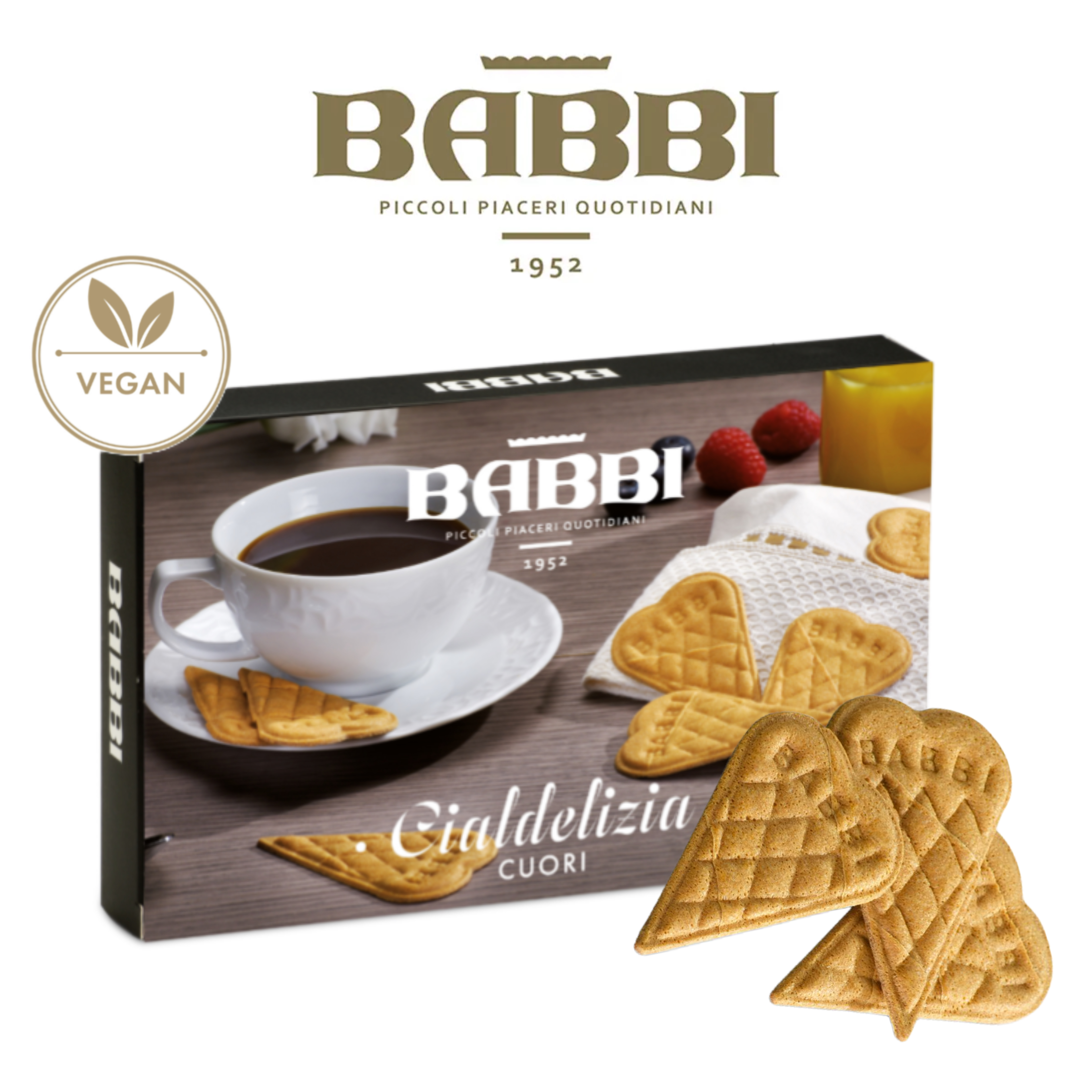 每包5g x 12 * 金黃色的威化輕盈脆口,帶少許甜餅乾味 * 非常適合配雪糕、茶或咖啡 Babbi Cialdelizia Cuori是精緻烤製的心形威化,質地細膩酥脆——是意大利糕點傳統的經典之一。金棕色,烘烤成心形,它們是咖啡茶的完美搭配,也可以作為雪糕或甜品的良伴。無論是作為小禮物、或精心準備招待賓客,還是下午茶小吃——這些心形威化都是錯不了的選擇。 Babbi是意大利最著名的甜品製造商之一,其令人印象深刻的歷史可以追溯到1952年。該品牌以特殊的杏仁和蜂蜜牛軋糖而聞名,使Babbi成為意大利甜品界的先驅。 成份: 小麥粉、糖、薯仔澱粉、椰子油、乳化劑:大豆卵磷脂、著色劑:亞硫酸鹽-氨-焦糖、調味劑紅椒粉提取物、抗氧化劑:生育酚、鹽、天然香料 ⚠️可能含雞蛋、牛奶 * Each golden wafer is light and crisp with a sweet, biscuity flavour * Perfect for snacking and dunking in ice cream, tea or coffee Babbi's Cialdelizia Cuori are delicately baked heart-shaped wafers with a fine, crispy texture - a classic example of Italian patisserie tradition. Golden brown and delicately baked in the shape of a heart, they are the perfect accompaniment to coffee, tea or as a stylish addition to ice cream and desserts. Whether as a small gift, a lovingly prepared table treat or a sweet snack for in between meals - these wafer hearts combine fine taste with Italian elegance. A touch of dolce vita for every day. Babbi, one of Italy's most renowned confectionery manufacturers, has an impressive history dating back to 1952. The brand is particularly well known for its delicious nougat specialities, rich in exceptional almonds and flavoured with honey. These traditional delicacies embody the artisan elegance and incomparable flavour that have made Babbi a pioneer in the world of Italian confectionery. Ingredients: Wheat flour, sugar, potato starch, coconut oil, emulsifier: soy lecithin, colouring agent: sulphite-ammonia-caramel, flavourings, paprika extract, antioxidant: tocopherols, salt, natural flavourings ⚠️ May contain EGGS and MILK
