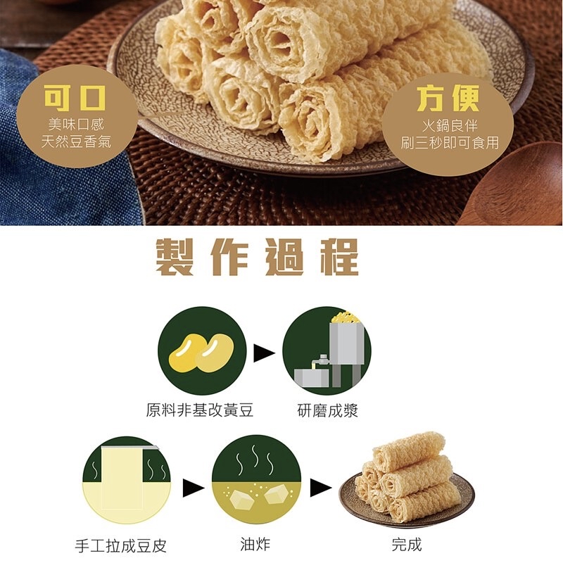 每包六條80g per pack of 6 rolls * 使用無氫化的植物油油炸而成 * 100%嚴選非基因改造黃豆製造 * 無添加防腐劑、漂白劑、色素等 * 100%純素,無動物性成分 * 獲兩大認證:ISO國際保證、HACCP 本家生機食材生產的有機及非基改豆製品,製作過程全程開放、透明化。水質對於製作豆腐非常重要,本家生機採用不鏽鋼器具及RO逆滲透水,無傳統木質材料容易滋生細菌霉菌的疑慮,並嚴選單一品種的非基因改造黃豆,豆腐製作成分天然,只使用鹽滷及石膏當作凝固劑。 響鈴在香港是常見的美食。使用食品級非基因改造黃豆手工製成,用無氫化的植物油油炸而成,下鍋3秒即可進入您的嘴巴!火鍋、湯品涮上三秒,立即吸收湯頭精華,入口滑嫩細膩,讓人欲罷不能,一口接一口! 天然手作非基改涮涮響鈴卷: ✔️港式傳統工藝:傳統港式工藝手工製作 ✔️雖是油炸但健康不可少:使用無氫化的植物油油炸而成,身為油炸品是您注重健康的最佳選擇,雙倍脫油無油耗味! 成份: 水、非基因改造黃豆、無氫化植物油、脂肪酸甘油酯、碳酸鈣、碳酸鎂、卵磷脂 * Deep fried with non hydrogenated vegetable oil * 100% non-GMO soy beans used * No preservatives, no bleaching or colouring * 100% vegan, strictly no animal products used * ISO / HACCP certified The production of organic non-GMO soybean products by Benjia is open and transparent throughout the whole process. Water quality is most important for making tofu. Benjia uses stainless steel equipments and reverse osmosis water as the basis. No traditional wood material is used to avoid breeding of bacteria or mold. The ingredients are all natural, only salt brine and gypsum are used as coagulants. 3-second beancurd rolls are excellent for hotpot, they absorb large amount of soup quickly, their puffy layering structure gives you excellent mouthfeel. A must have item for hotpot ! Ingredients: Water, non-GMO soybeans, non hydrogenated vegetable oil, fatty acid glycerides, calcium carbonate, magnesium carbonate, lecithin