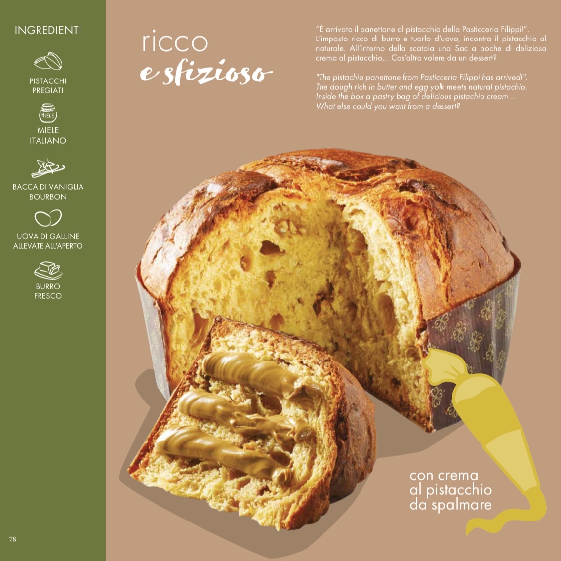 每個 1kg ⭐️ 早鳥價至十二月十號 ⭐️ ❤️ 額外包含一袋開心果醬 * 使用來自厄瓜多爾農民種植的可可豆Criollo、Trinitario * 麵團天然慢慢發酵,更健康更容易消化 * 只使用自由放養雞隻的雞蛋 * 來自馬達加斯加的有機和經過認證公平貿易種植的Planifolia Bourbon雲尼拿 * 水果蜜餞來自西西里島、卡拉布里亞,都是天然加工沒以機械加壓,水果保持非常柔軟,味道濃郁,含最天然的果油,香味無懈可擊 * 提子乾入口的,因澳洲提子乾被認為是最好的其中一種 * 使用的冷榨特級初榨橄欖油是產自西西里海拔150-550米 Iblei 山脈最古老的橄欖樹,混合不同品種的橄欖 * 以天然蜜糖作為甜味,與較少的蔗糖結合使用 * B Corp認證 —— 顯示特別關注社會和環境需要,包括可持續發展、廠房更具備滿足美國最高「綠色建築」標準的條件 * 與B Corp的理念一致,Filippi 不單是一家能達到100%碳中和的公司,而且旨在保護生物多樣性,更特別協助改善哥倫比亞森林當地社群的生活條件 Filippi是一家家族經營的意大利公司,每個人都尊重大家的共同價值觀。Filippi 發展的秘訣在於不斷研究、優質選擇和用心——尋找最稀有最天然的原料,專注於保護生物多樣性,並儘可能選擇當地的出產。 像酒酵母一樣,天然酵母會產生酒精發酵,也會帶來乳酸發酵,乳酸菌會把麵粉變成糖,部分進入乳酸,部分進入乙酸。麵糰在一個酸的環境,因此能預防可能的病原體,並自然地延長酵母的儲存時間。使用天然發酵的產品更健康,更容易被人體消化,Filippi的酵母種已經存活了五十多年。天然發酵和用酒酵母發酵的麵包有明顯的區別,只有天然酵母才能造出麵包獨特的口感和風味。 成份: 小麥粉,開心果醬(糖/可可脂/開心果醬/脫脂奶粉/乳清粉/葵花卵磷脂/調味劑)、牛油、水、蔗糖、天然酵母(小麥粉/水)、蜜糖、單甘油酯和雙甘油酯脂肪酸、鹽、天然香料 ⚠️ 含:小麥、牛奶、雞蛋、開心果。可能含微量果仁(杏仁/榛子/合桃)、大豆、花生和芝麻 ⭐️ Early bird special until December 10th ⭐️ ❤️ A bag of delicious pistachio cream included * Criollo and Trinitario cocoa from growers in are being chosen * Natural leaven - a natural leavening makes products healthier and more digestible * Only use eggs from free range raised chickens * Vanilla from organic and certified fair trade cultivations from Madagascar, of Planifolia Bourbon type * Candied fruits from Sicily, Calabria. All fruits are processed naturally without mechanical pressure, fruits maintain very soft with a strong flavour, rich in essential oils with an unmistakable fragrance * Raisins are Australian which are recognised as one of the best * Olives are picked from Iblei Mountains in Sicily where the most ancient olive trees are planted * A blend of cold pressed extra virgin oil from olives of different varieties cultivated at 150-550 meters above sea level * Olive oil quality has been awarded many prizes and also acknowledged in the Flos Olei Guide, considered as the Sacred Book of the best olive oils on the market * Honey as natural sweetener, dosing it in combination with a lower amount of cane sugar * B Corp certified - devote special attention to social and environmental needs including meeting the highest U.S. "green building" standard addressed to a sustainable and efficient way * In line with the B Corp philosophy, Filippi is now a 100% Carbon Neutral Company. Intended for the safeguarding of biodiversity and the improvement of the living conditions of the local community of Mataven Forest - Colombia Filippi is a family-run company, where everyone feels at ease in a serene atmosphere of respect for shared values ​​and a quality project across the board. The secret of Filippi products lays in research, selection and care - searching for the rarest ingredients, based on genuineness of natural ingredients, focus on preservation of biodiversity and whenever possible choose local ingredients. Like brewer’s yeast, natural yeast brings about alcoholic fermentation but also lactic fermentation, similar to what happens in yogurt, where lactic bacteria turn flour sugars partly into lactic acid and partly into acetic acid. The result is the creation of a sour environment inside the dough (from here the name of sour leaven/dough) such that it is able to prevent possible pathogenic organisms and to naturally lengthen the leavens’ preservation time. A natural leavening makes products healthier and more digestible. Filippi’s mother dough has been kept alive for more than fifty years. The immediately noticeable differences between products leavened naturally and products raised with brewer’s yeast is in the unique consistency and taste that only a natural leaven yeast can give. The criollo cocoa variety represents a very small percentage of total cocoa from all over the world and for this reason it is much sought after by the pastry chefs and the most demanding palates. Ingredients: wheat flour, cylinders with pistachio paste (sugar / cocoa butter / pistachio paste / skimmed milk powder / whey powder / sunflower lecithin / flavouring), butter, water, cane sugar, natural yeast (wheat flour / water), honey, mono and diglycerides of fatty acids, salt, natural flavouring ⚠️ Contains: wheat, milk, egg, pistachio. May contain tree nuts (almond / hazelnut / walnuts), soybeans, peanut and sesame seeds